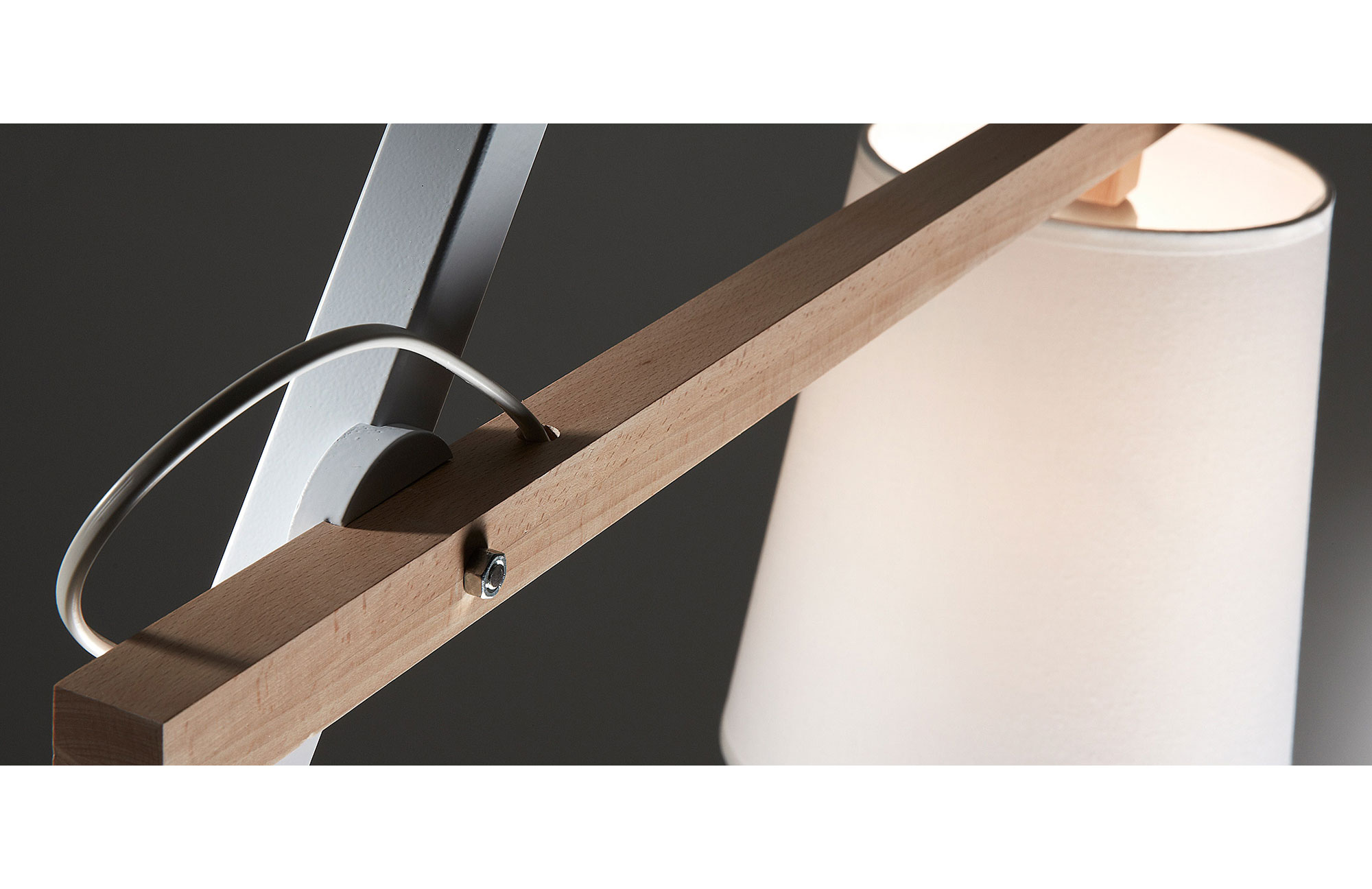 Descripción : Lámpara de salón con pié en madera y metal. Pantalla de algodón. Para bombilla E-27 no incluida. Color : Blanco Puro. Materiales. Madera;Tejido;Metal. Mantenimiento : Limpiar con un paño seco.