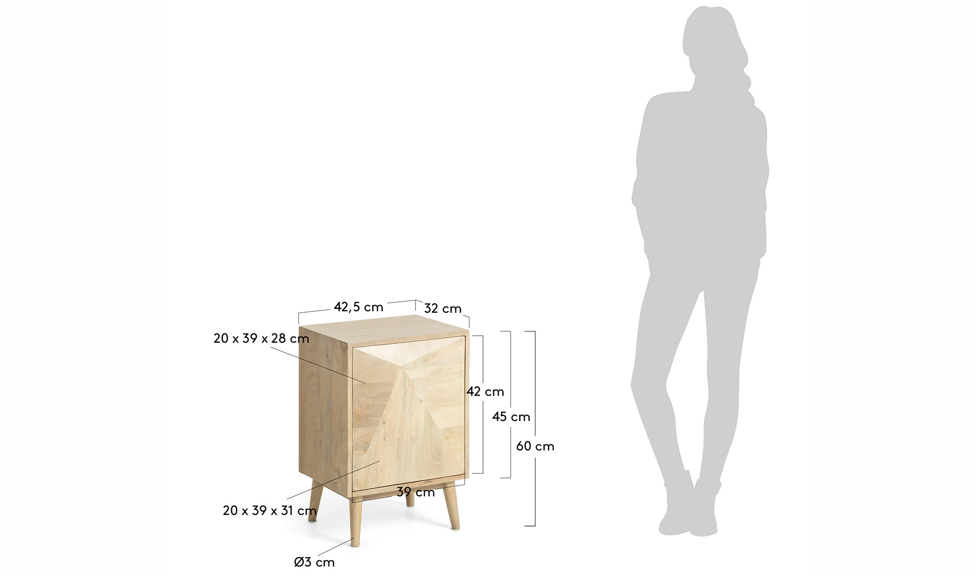 Mesita de noche con estructura de madera de mango macizo natural y puerta tallada