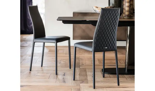 Silla con estructura en acero tapizada y completamente revestida en tejido, piel sintética, piel según muestrario. Respaldo exterior acolchado. El tapizado no es desenfundable
