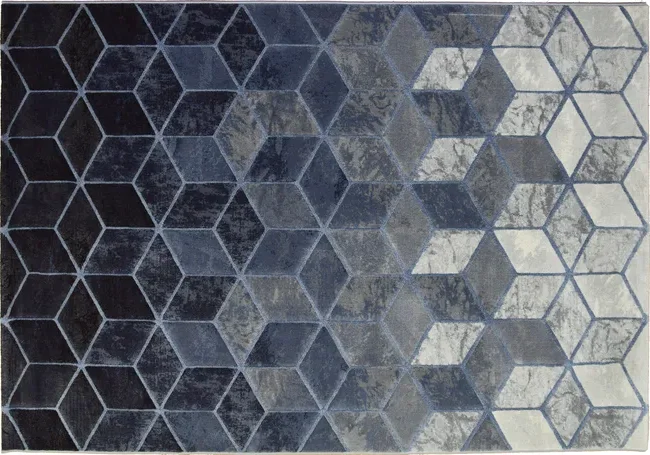 La alfombra geométrica Monetti es una pieza decorativa ideal para aportar sensación de amplitud y profundidad visual a cualquier estancia. Su diseño geométrico en forma de cubos crea un atractivo efecto tridimensional, con un elegante degradado de tonos azules y grises que va de los matices más oscuros a los más claros, aportando dinamismo y sofisticación al espacio.