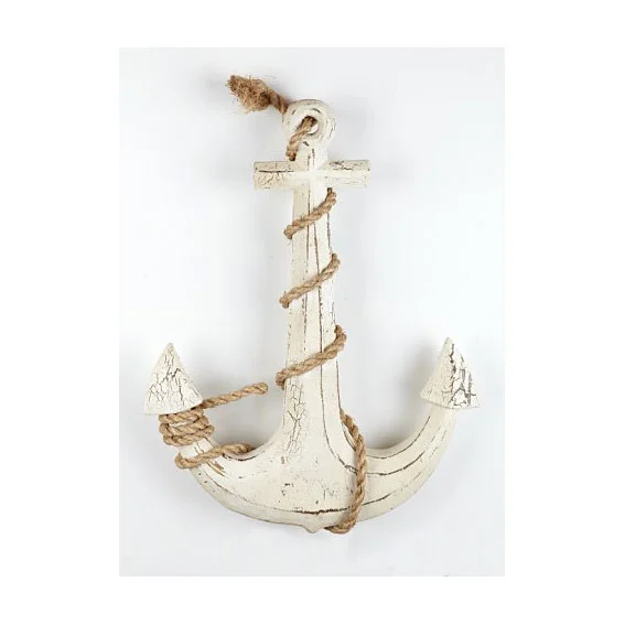 Ancla de barco rústica decorativa de madera maciza atada a una cuerda de cáñamo. Bonita reproducción del ancla utilizada por los barcos para evitar derivar impulsados por los vientos o arrastrados por las corrientes.