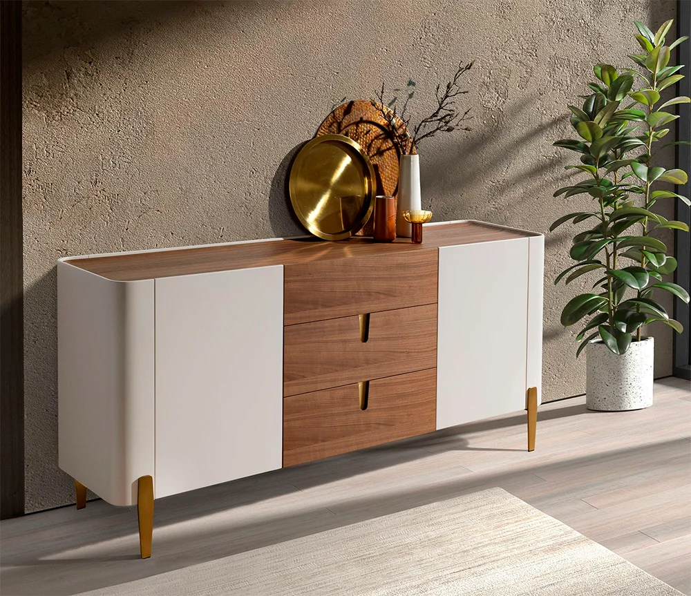 Aparador moderno de madera chapada en nogal y beige con detalles dorados y sistema soft-closing