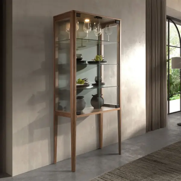 Vitrina de diseño moderno, ideal para salones contemporáneos, fabricado en madera chapada en nogal natural y cristal, que combina elegancia y funcionalidad. Sus originales patas en nogal aportan un estilo sofisticado y actual, perfecto para realzar cualquier espacio.