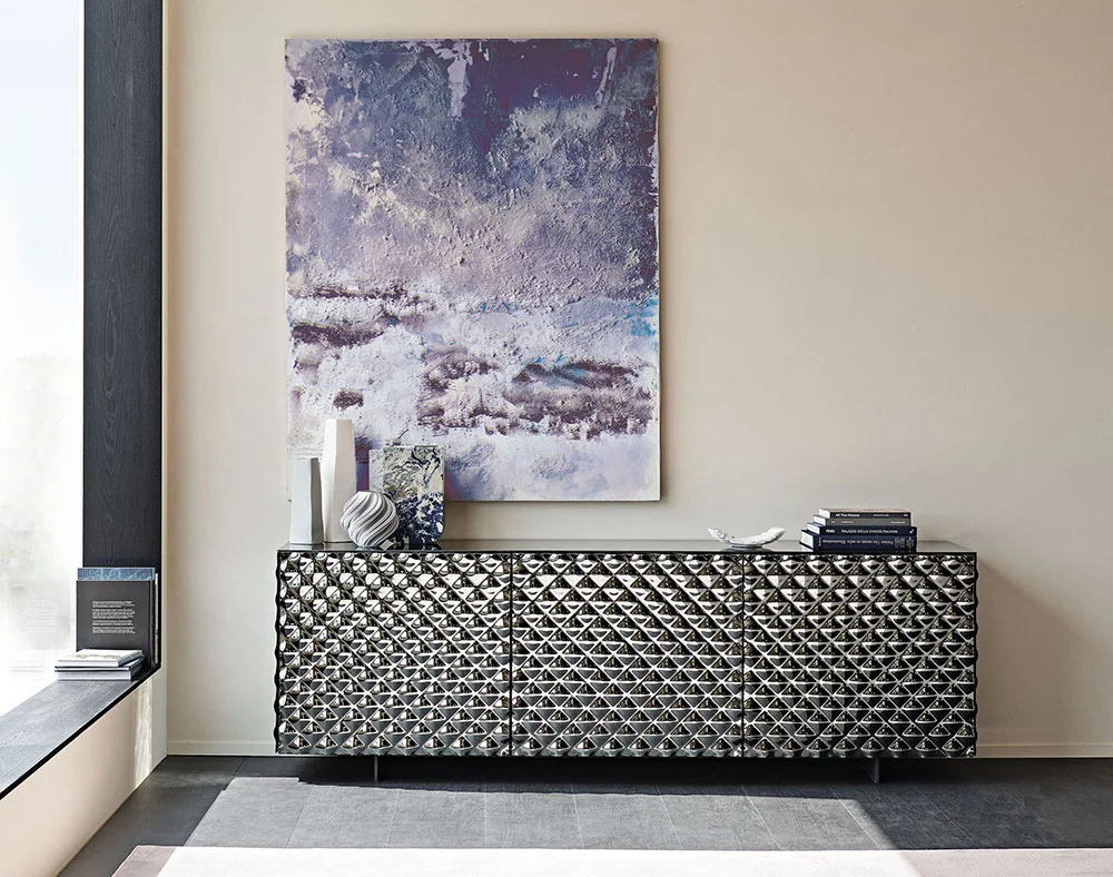 Realizado conjuntamente entre Paolo Cattelan y Lorenzo Remedi, el aparador moderno Vivaldi es dueño de un encanto hipnótico, sin igual . Las puertas crean un juego de luces difusas, donde se reflejan los objetos y las fuentes de luz alrededor. El acabado frontal de este aparador de diseño está constituido por cristal espejado couture, finamente elaborado. El cristal está modelado con una técnica sin precedentes, que permite dar a la superficie un efecto tridimensional, como una colchadura en un tejido. Para la superficie de apoyo se ha escogido el cristal, que refleja los objetos exhibidos en este seductor aparador espejado.