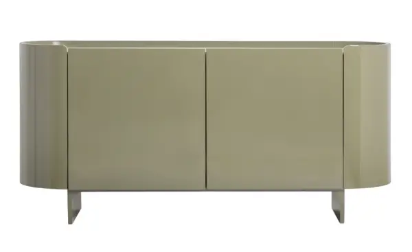 El diseño del aparador incluye dos puertas que permiten un fácil acceso al almacenamiento interno, lo que lo convierte en una solución práctica para mantener el espacio organizado. Además, su forma curvilínea y contornos suavemente definidos lo diferencian de los aparadores tradicionales, haciendo que sea un punto focal en cualquier habitación.