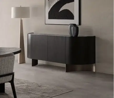 Este aparador destaca por su diseño sofisticado y contemporáneo, con líneas curvas y una presencia elegante que lo convierte en una pieza protagonista del espacio. Está fabricado en madera de roble con un acabado en color marrón, que aporta profundidad visual y resalta la textura natural de la madera, transmitiendo calidez y solidez. La estructura se combina con detalles en acero inoxidable en color oro mate, visibles en la base y herrajes, que aportan un contraste refinado y un toque de lujo discreto. Cuenta con un amplio espacio de almacenamiento interior, organizado mediante compartimentos y estantes, accesibles a través de puertas abatibles que mantienen una estética limpia y ordenada cuando están cerradas. Las superficies presentan un acabado cuidado y elegante, con una sensación robusta pero equilibrada. Con unas dimensiones de 220 cm de ancho, 50 cm de fondo y 85 cm de alto, este aparador es ideal para salones o comedores amplios, combinando funcionalidad, materiales nobles y un diseño moderno y atemporal.