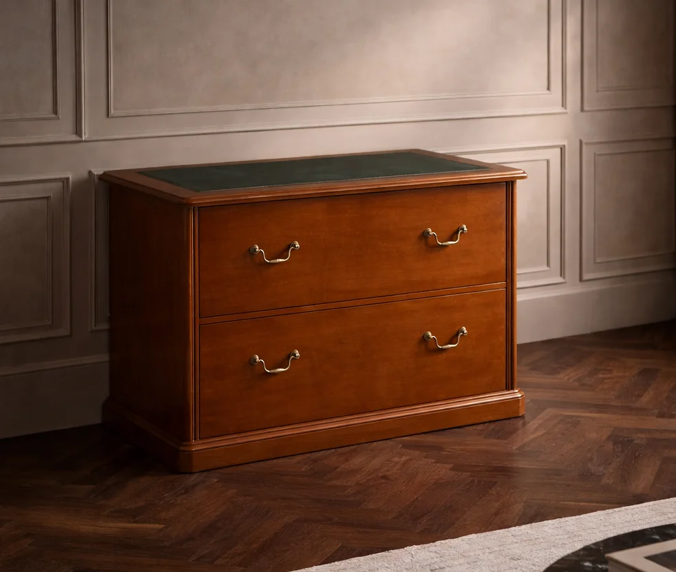 Completa tu despacho con este archivador clásico de chapa natural de cerezo, una pieza funcional y elegante diseñada para mantener tus documentos perfectamente organizados sin renunciar al estilo. Su estructura robusta y líneas tradicionales lo convierten en un complemento ideal para oficinas de estética clásica y profesional.