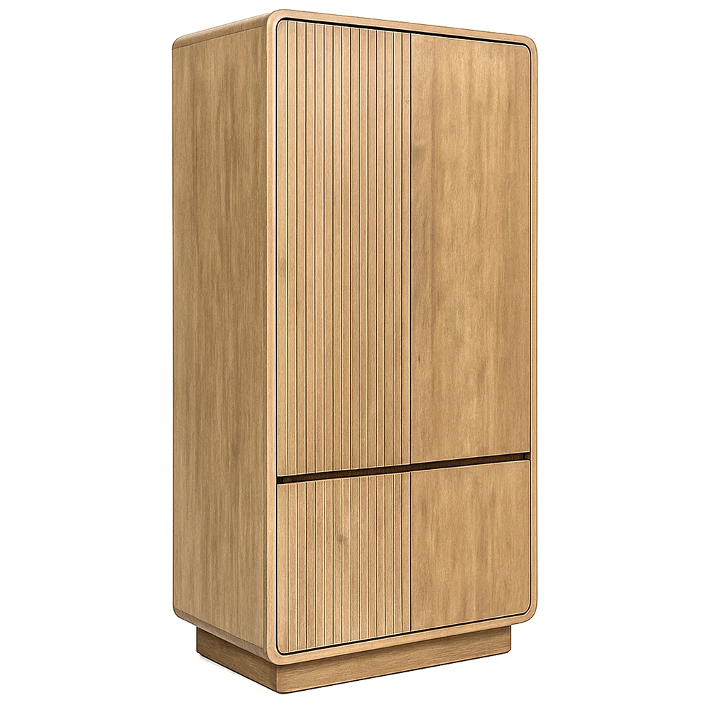Armario de 4 puertas en madera de teca natural, modelo Eyre. Su diseño limpio y robusto combina elegancia y practicidad para el almacenamiento diario. Ofrece un interior espacioso ideal para organizar ropa y complementos. La nobleza de la teca aporta un toque cálido y atemporal.