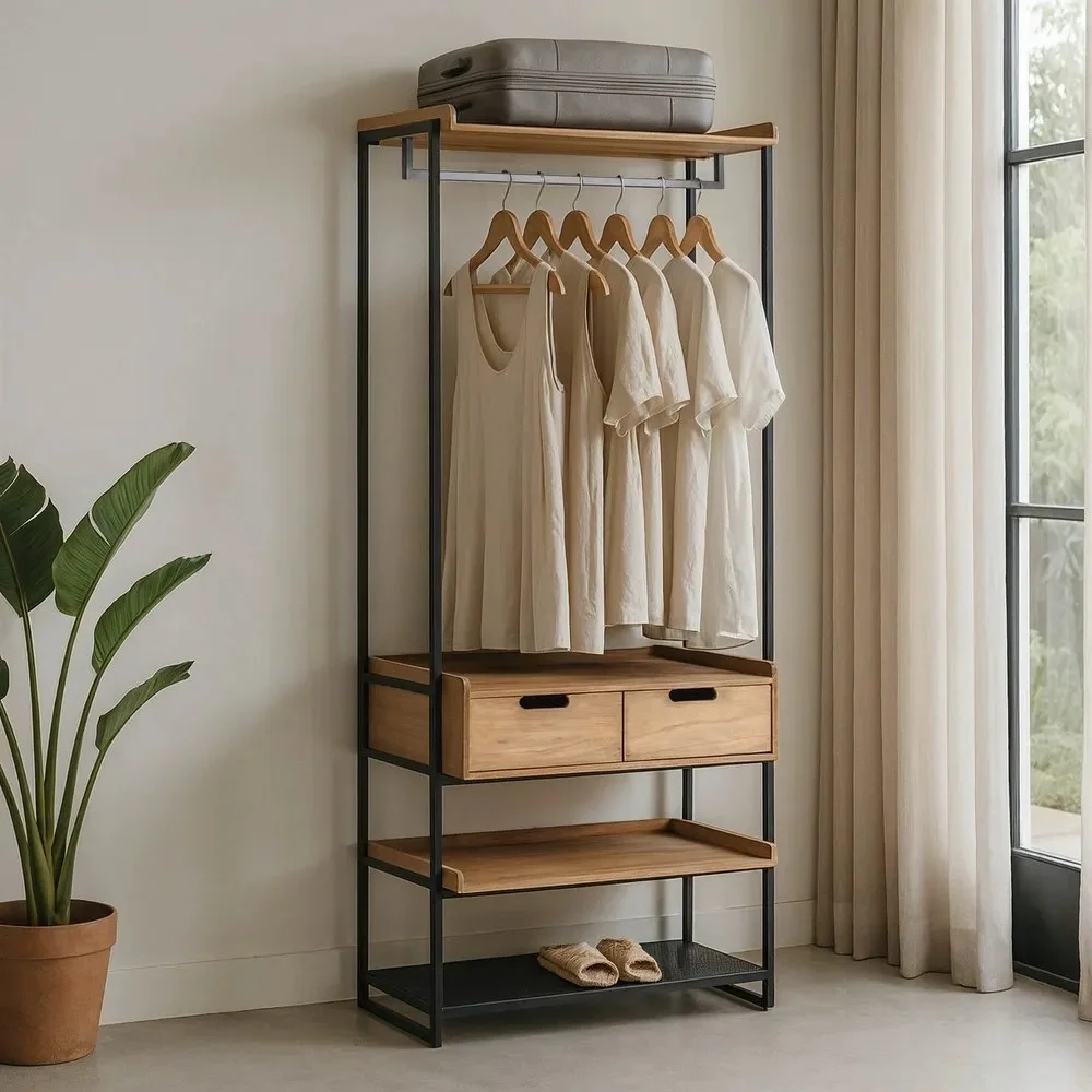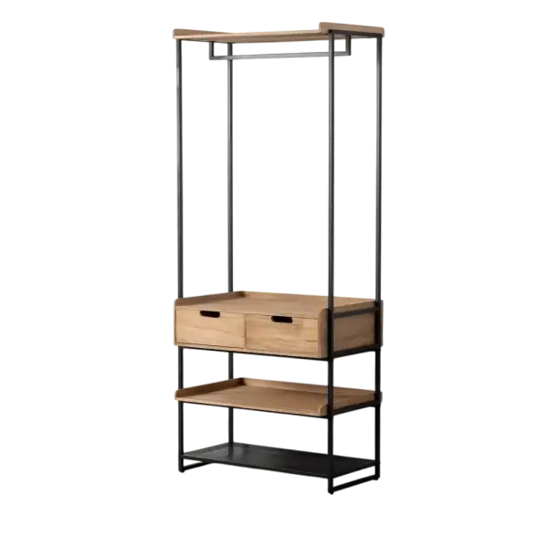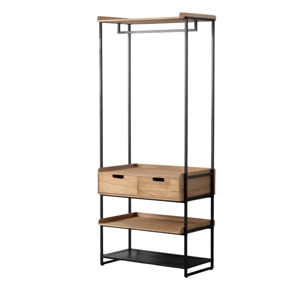 El vestidor cuenta con dos cajones que miden 36,5 cm de ancho y 14,8 cm de alto, perfectos para guardar accesorios, ropa interior u otros artículos pequeños, manteniéndolos escondidos y organizados. Además, la altura desde el estante de madera hasta el módulo de cajones es de 22 cm, lo que proporciona un espacio adecuado para colocar objetos adicionales o decoraciones, mientras que la altura entre el estante metálico y la de madera es de 25 cm.