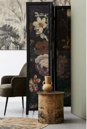 Se trata de un biombo decorativo de tres hojas, de estilo elegante y atemporal. Está fabricado con una estructura ligera y resistente, compuesta por un 70 % de bambú y un 30 % de madera de abeto, lo que le aporta estabilidad sin perder delicadeza visual. Cada panel presenta un diseño floral de inspiración clásica, con grandes flores en tonos suaves como beige, crema y rosados, acompañados de sutiles toques de azul, todo ello sobre un fondo oscuro que crea un contraste sofisticado y decorativo. El entramado de bambú deja entrever una textura delicada que aporta profundidad y un aire artesanal, ideal para crear ambientes cálidos y acogedores. Con unas medidas de 120 x 2 x 180 cm de alto, resulta perfecto para separar espacios, proporcionar privacidad o actuar como un elegante elemento decorativo en salones, dormitorios o recibidores.
