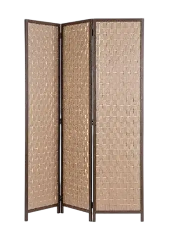 Este biombo está elaborado con una cuidada combinación de bambú, papel y madera de álamo, materiales naturales que aportan ligereza, calidez y un estilo artesanal. Su diseño de tres paneles presenta superficies trenzadas y texturizadas que crean un atractivo efecto visual, enmarcadas por una estructura de madera oscura que aporta contraste y definición. El entramado de bambú y papel permite tamizar la luz de forma suave, generando ambientes acogedores y equilibrados. Gracias a su estructura plegable, se adapta fácilmente a diferentes espacios y usos, ya sea para separar ambientes o como elemento decorativo. Con unas medidas de 135 cm de ancho, 6 cm de fondo y 180 cm de alto, este biombo combina funcionalidad y estética natural, convirtiéndose en una pieza decorativa elegante y versátil para cualquier estancia.