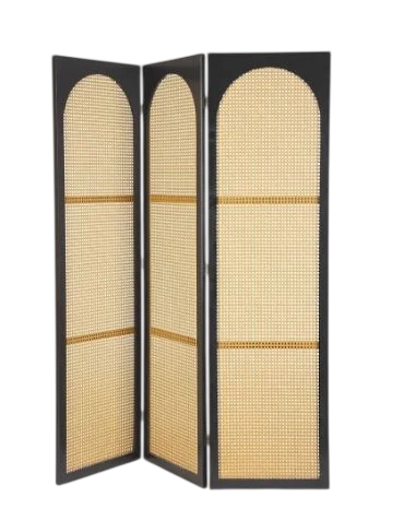 Se trata de un biombo decorativo de tres hojas con un diseño sobrio y natural, ideal para aportar calidez y ligereza visual al espacio. Cuenta con una estructura realizada en madera de pino, que proporciona firmeza y durabilidad, combinada con una inserción de ratán trenzado que deja pasar suavemente la luz y aporta un aire artesanal y acogedor. Los paneles presentan una elegante forma arqueada en la parte superior, lo que le confiere un estilo refinado y equilibrado, perfecto para interiores de inspiración natural, mediterránea o contemporánea. Su acabado en tonos claros y neutros facilita la integración en distintos ambientes. Con unas medidas de 150 x 2 x 180 cm de alto, es ideal para separar espacios, crear zonas de privacidad o utilizarse como elemento decorativo en salones, dormitorios o vestidores.