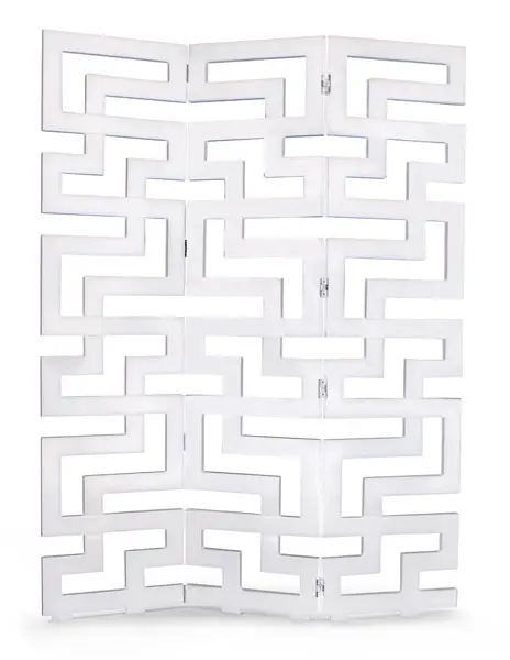 Realizado con materiales de alta calidad y un acabado blanco impoluto, este biombo decorativo de diseño no solo separa ambientes, sino que los transforma. Su patrón entrelazado aporta dinamismo visual y juego de luces, perfecto para espacios amplios, recibidores, salones o suites de hotel.