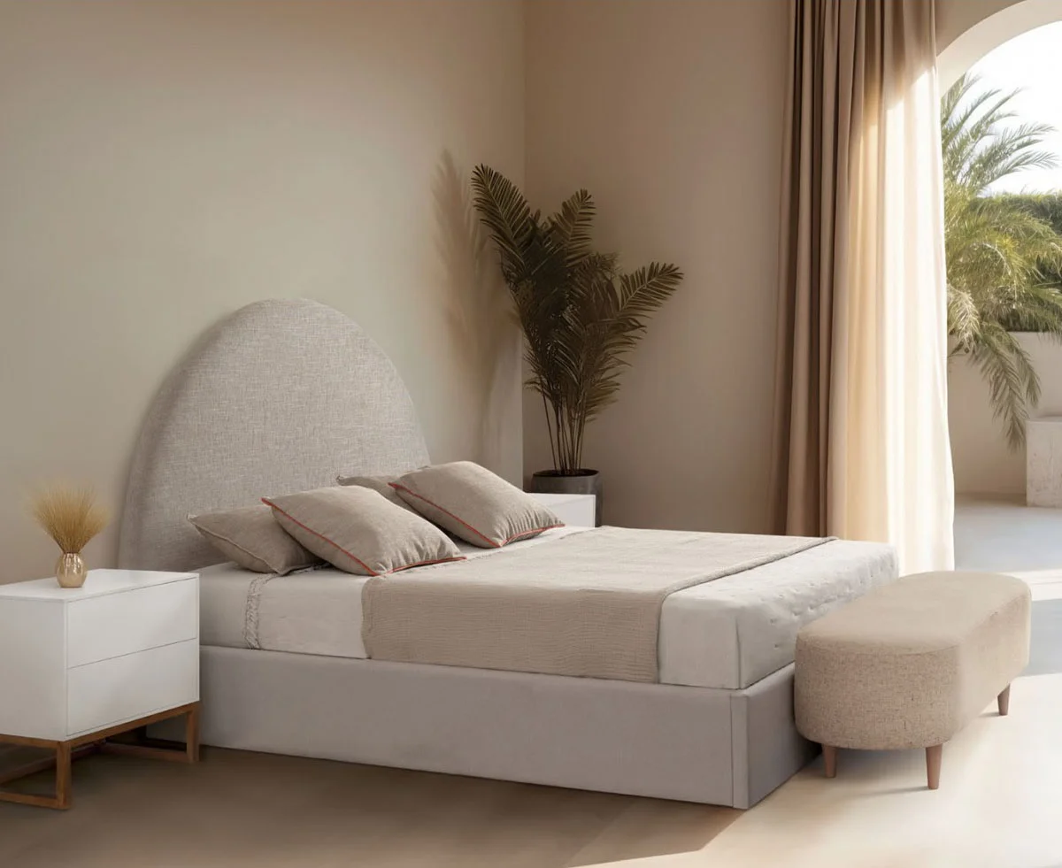 Su elemento principal es el cabecero en forma de arco, muy decorativo, con una estética suave y contemporánea que aporta calidez al ambiente.