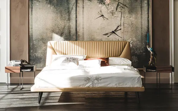 Cama embutida revestida de tejido, patas en acero barnizado bronce mate, gofrado blanco o grafito