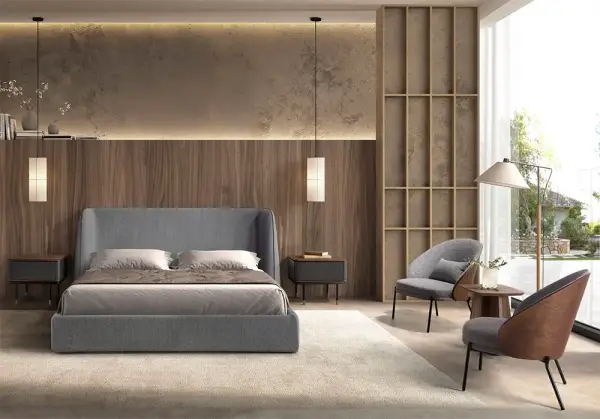 Cama de matrimonio de diseño moderno con cabecero original y estructura completamente tapizada en elegante tela color gris oscuro, ideal para aportar sofisticación y calidez al dormitorio. Su diseño envolvente y sus patas de acero inoxidable en color negro refuerzan su estética contemporánea, convirtiéndola en una pieza protagonista dentro de cualquier espacio de descanso.