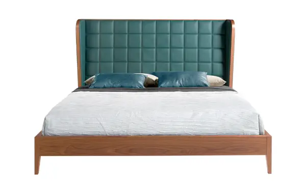 Descubre la cama de matrimonio de diseño moderno que añadirá un toque elegante y acogedor a tu dormitorio. Con un original cabecero en polipiel color verde oscuro y una estructura de madera chapada en nogal natural, esta cama se convierte en una pieza clave para cualquier espacio contemporáneo.