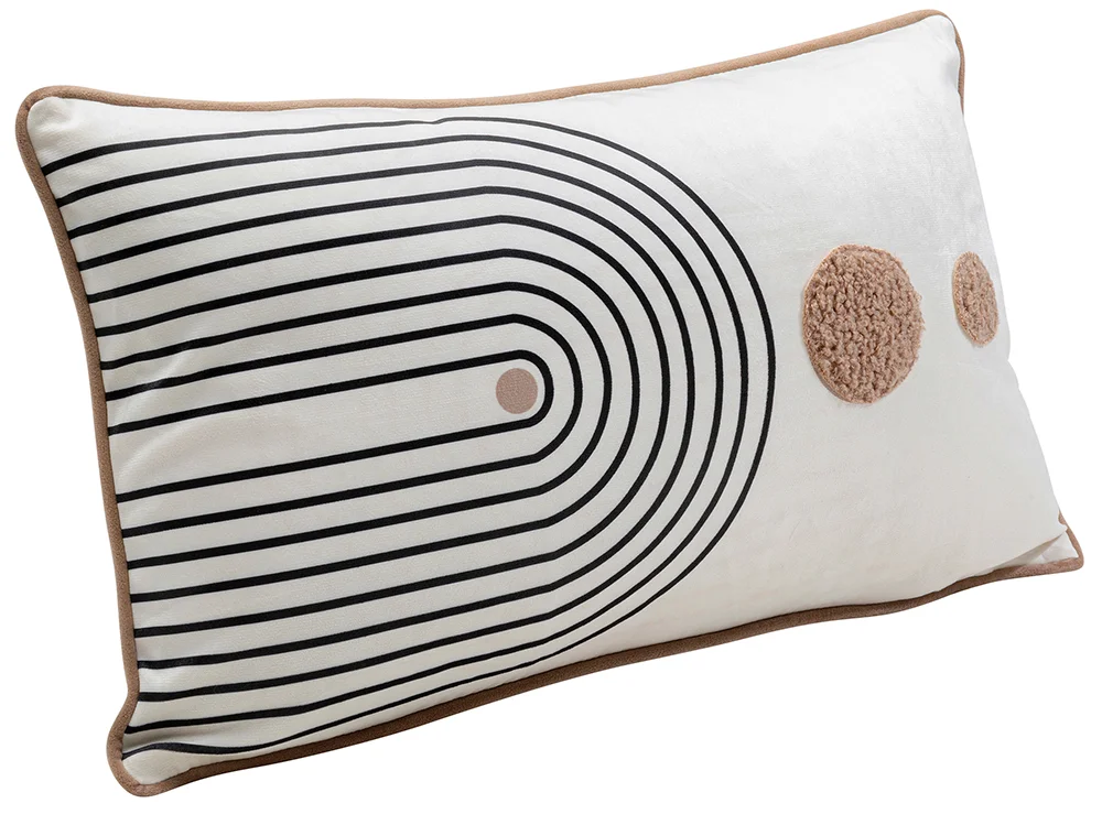 Aporta un toque sofisticado a tu salón con este cojín rectangular para sofá, acabado con un elegante ribete en color beige. Su diseño combina una paleta atemporal de beige claro, marrón y negro, ideal para integrar en estilos decorativos modernos o clásicos.