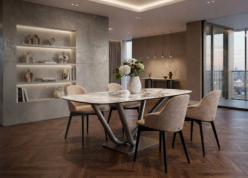 La mesa combina una estructura metálica de diseño escultórico con una tapa de alta calidad, normalmente en porcelánico o cerámica, lo que garantiza resistencia, durabilidad y fácil mantenimiento.