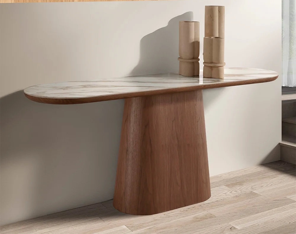 Consola ovalada medio punto de diseño moderno con tapa de mármol porcelánico y patas de nogal