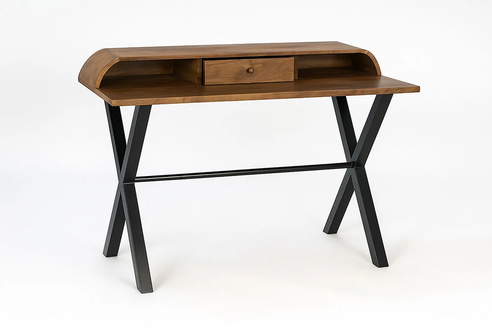 Aporta carácter y funcionalidad a tu espacio con el escritorio de diseño industrial de 125 cm, una pieza que combina la calidez de la madera maciza de mango con la fuerza del hierro lacado en negro. Su estructura en forma de “X” le confiere un aire contemporáneo y estable, mientras que su sobre curvado con compartimentos abiertos y cajón central ofrece un práctico espacio de almacenaje.