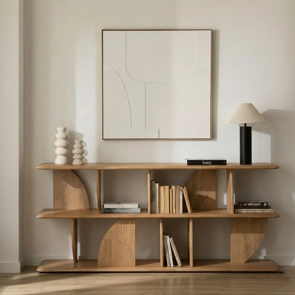 Esta estantería está fabricada en madera de caucho con un acabado natural que resalta la veta y aporta una sensación cálida y orgánica. Su diseño es moderno y escultórico, combinando líneas rectas con paneles curvos que actúan como soporte y elemento decorativo. Consta de tres niveles horizontales unidos por divisores verticales y piezas semicirculares colocadas de forma alternada, creando compartimentos visualmente interesantes y una estructura equilibrada. Los bordes de las baldas son suavemente redondeados, lo que añade una sensación de fluidez al conjunto. Mide 180 cm de ancho, 38 cm de fondo y 83 cm de alto. Su estética minimalista y geométrica la hace ideal para salones, estudios o espacios contemporáneos donde se busque una pieza funcional y decorativa al mismo tiempo.
