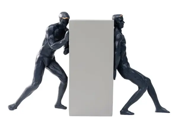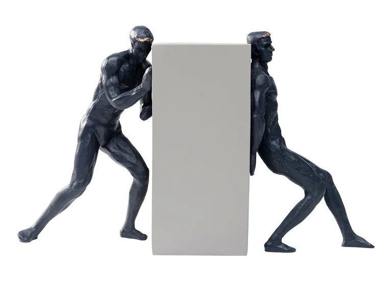 Decoración original y con carácter: esta escultura representa a dos figuras masculinas enfrentadas en una simbólica lucha de poder, cada una empujando un bloque blanco que las separa. Una pieza impactante que aporta dinamismo y significado a cualquier espacio.