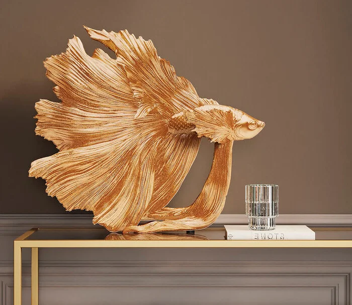 El pez decorativo dorado es una brillante obra de arte que aporta un toque de lujo y sofisticación a cualquier ambiente. Su diseño, inspirado en el elegante pez luchador siamés, lo convierte en una pieza central perfecta para el salón, el dormitorio o incluso el baño.