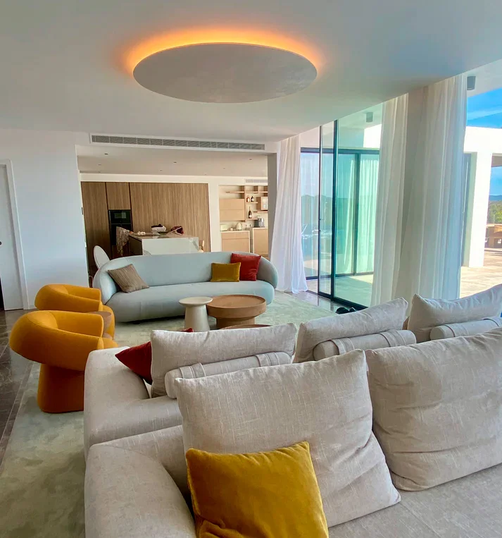 A pesar de su amplio diámetro de 160 cm, PLENILUNIO se integra de forma sutil en el techo. Su forma ligeramente convexa y su superficie de textura granulada evocan la cerámica cocida, combinando un tono blanco con matices de rosa palo que aporta un suave contraste decorativo sin romper la estética del entorno.
