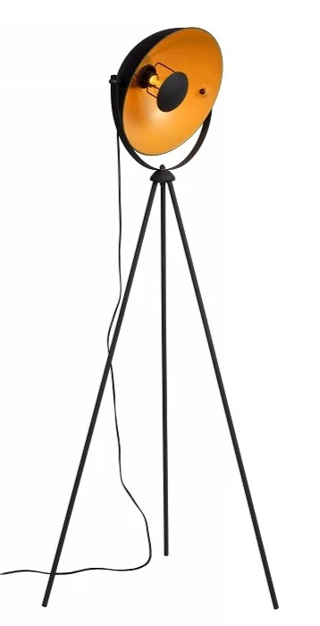 La lámpara de pie trípode de acero en acabado negro con interior en dorado mate es una pieza de iluminación decorativa de estilo moderno e industrial, ideal para salones, despachos o zonas de lectura. Su pantalla semicircular en acero con interior dorado refleja la luz creando un efecto cálido y elegante, aportando carácter y sofisticación al espacio.