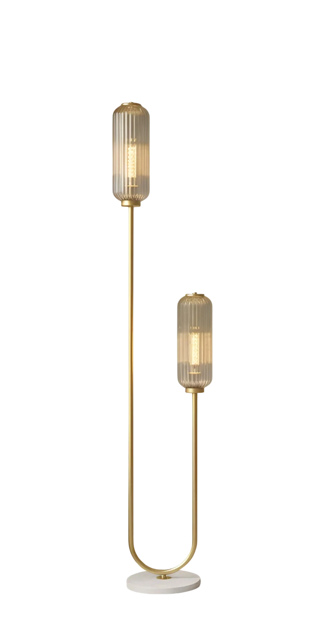 La lámpara de pie doble en metal acabado dorado es una pieza de iluminación decorativa elegante que combina diseño moderno y funcionalidad. Su estructura estilizada con dos puntos de luz y pantallas de vidrio acanalado proporciona una iluminación difusa y cálida, ideal para crear ambientes acogedores en salones, dormitorios o zonas de lectura.