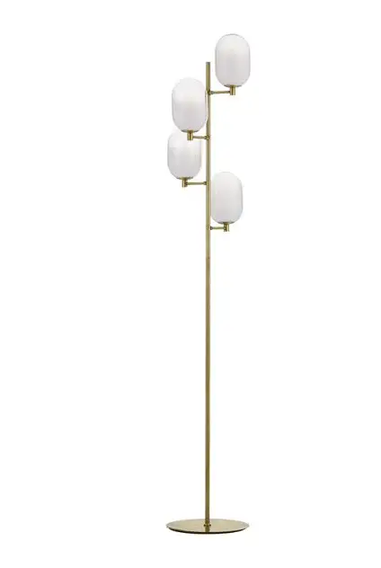 Esta lámpara de pie de diseño destaca por su estética elegante y contemporánea, combinando vidrio blanco con acabado gradiente y una estructura de metal dorado en latón que aporta un carácter sofisticado y decorativo. Sus cuatro difusores de vidrio suavizan la luz y crean una iluminación ambiental equilibrada, ideal para realzar el espacio sin deslumbrar. Funciona con cuatro bombillas LED G9 de 5W cada una (no incluidas), permitiendo personalizar la intensidad y el tipo de luz según las necesidades del ambiente. Con una altura de 165 cm, un ancho de 52,8 cm y un diámetro de base de 12 cm, su diseño vertical estilizado la convierte en una pieza protagonista perfecta para salones, comedores, dormitorios o espacios contract. Diseñada para uso interior, cuenta con protección IP20 y es una solución ideal para interiores modernos, art déco o contemporáneos que buscan una iluminación decorativa de alto nivel.