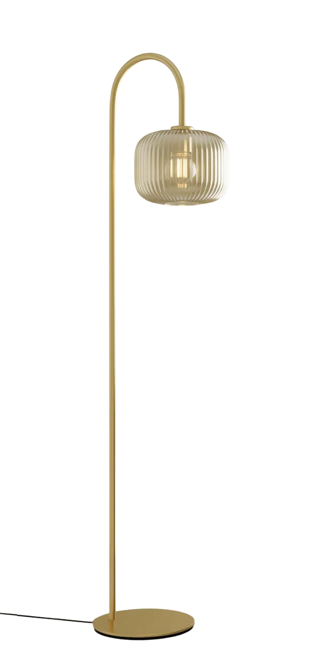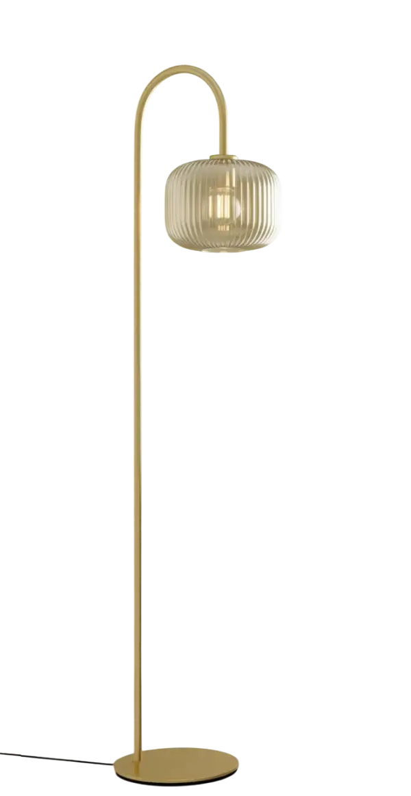 La lámpara de pie de arco en acero acabado dorado es una pieza decorativa elegante que aporta calidez y sofisticación a cualquier estancia. Su diseño curvo y estilizado, combinado con la pantalla de vidrio acanalado, proporciona una luz difusa suave, ideal para crear ambientes acogedores en salones, dormitorios o zonas de lectura.
