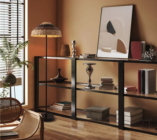 La lámpara de pie de ratán natural con estructura negra es una pieza decorativa que combina calidez artesanal y diseño contemporáneo, perfecta para crear ambientes acogedores y con personalidad. Su pantalla de ratán natural aporta textura y un juego de luces envolvente, ideal para salones, dormitorios o zonas de descanso.