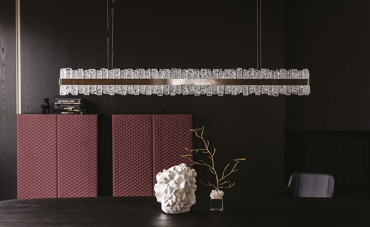 - Materiales: Estructura robusta en acero níquel satinado con elementos de vidrio soplado a mano, cada uno único en su forma y textura.