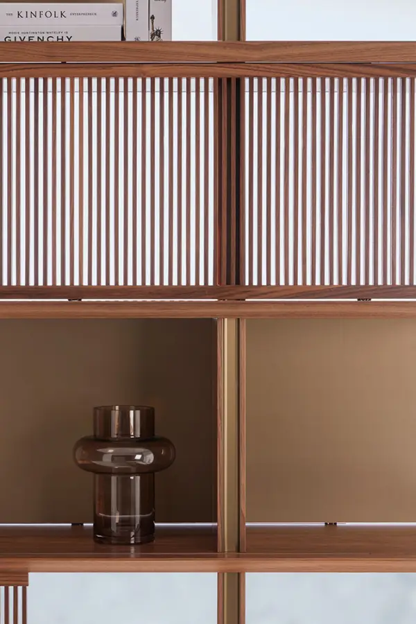- Estantes y costados en tablero de MDF E1 (bajo contenido en formaldehído) aplacado en madera de roble o nogal natural.