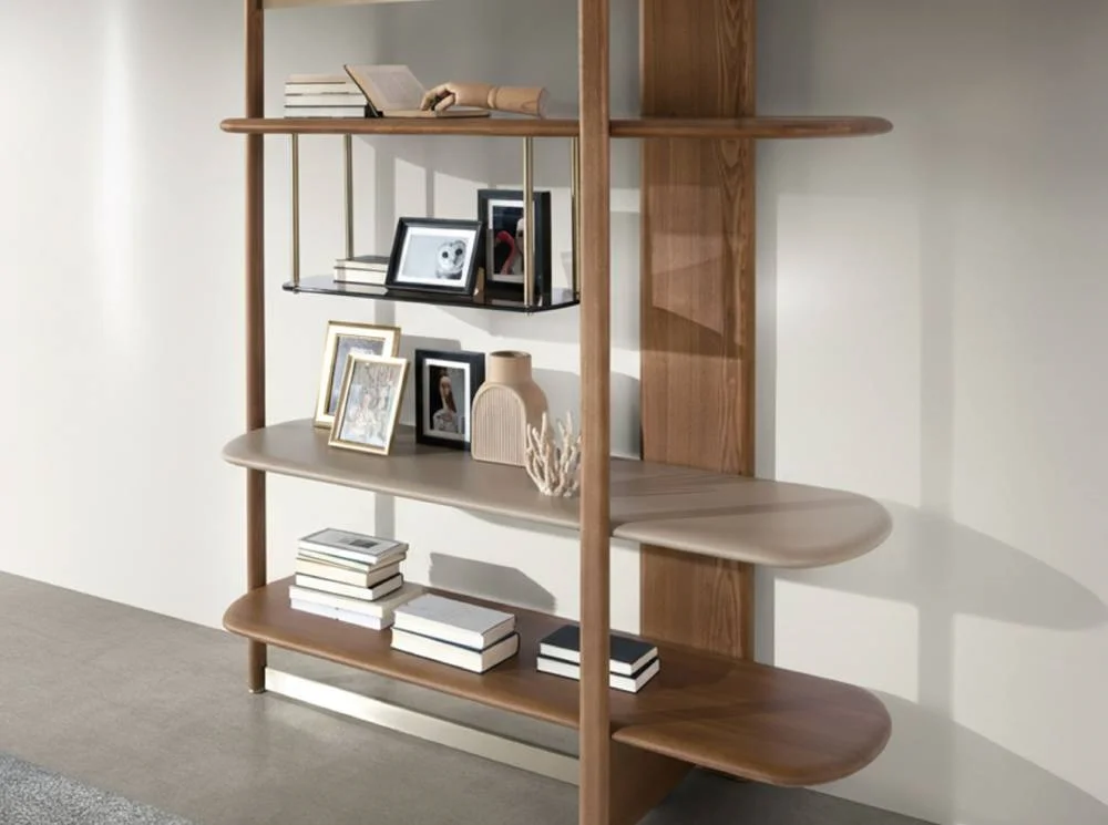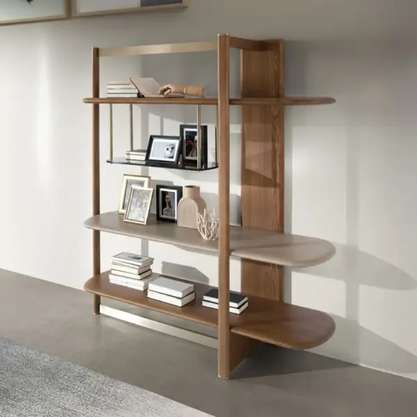 Estantería moderna de diseño elegante fabricada en madera color nogal claro, con estructura robusta y baldas combinadas en DM lacado color greige y cristal fumé marrón. Incorpora detalles en acero inoxidable color dorado pulido que aportan un contraste sofisticado y contemporáneo. Esta estantería de diseño es ideal para salones, despachos y espacios modernos, ofreciendo una solución de almacenaje funcional con un estilo decorativo exclusivo y de alta calidad.