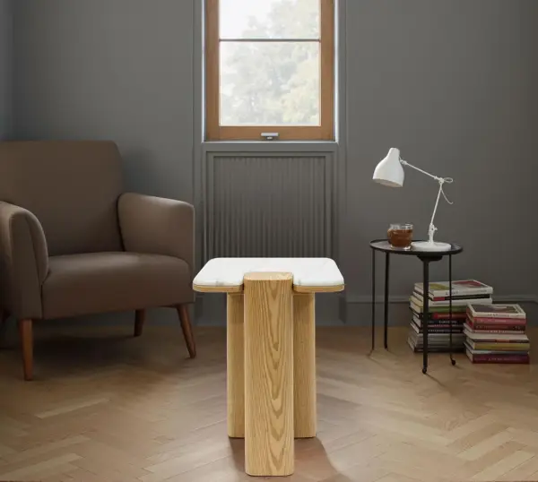 La estructura en chapa de madera de roble añade calidez, robustez y un acabado elegante, creando un contraste armonioso con la superficie de mármol. Gracias a su tamaño compacto y diseño versátil, la Apolo se integra con naturalidad junto a sofás, sillones o butacas, proporcionando un espacio funcional para colocar lámparas, libros, tazas o elementos decorativos.