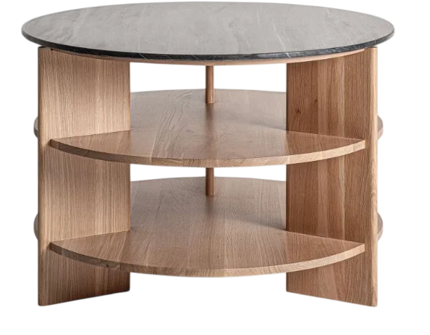 Mesa auxiliar redonda Nara roble natural y travertino negro