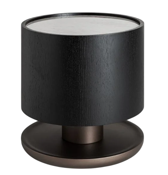 Su estructura, elaborada en roble negro, aporta una sensación de solidez y sofisticación. El acabado en negro de la madera resalta la belleza natural de las vetas del roble, creando un diseño que es a la vez moderno y acogedor. La forma cilíndrica de la base proporciona estabilidad y un aspecto elegante, mientras que la parte inferior en un tono más claro añade un sutil contraste que complementa el diseño general.