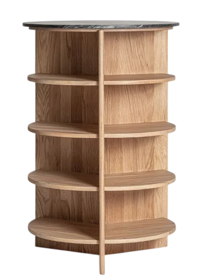 Esta mesa auxiliar presenta un diseño elegante y funcional, con una estética contemporánea de inspiración natural. Está fabricada principalmente en madera de roble con un acabado en color marrón claro, que resalta la veta natural de la madera y aporta calidez al conjunto. El material transmite solidez y calidad, con superficies suavemente pulidas y bordes redondeados que le dan un aspecto refinado y armonioso. La encimera superior es de mármol negro, un detalle sofisticado que contrasta con el tono claro del roble y aporta un toque moderno y elegante; el mármol cuenta con un acabado liso y pulido, ideal tanto desde el punto de vista estético como práctico. Su estructura es cilíndrica, con varios estantes abiertos distribuidos verticalmente, lo que la hace muy funcional para almacenar o exhibir objetos decorativos, libros o accesorios, mientras que un soporte vertical central divide visualmente los compartimentos y refuerza la estabilidad del mueble. Con unas dimensiones de 80 cm de ancho, 80 cm de fondo y 118 cm de alto, es una mesa auxiliar versátil, ideal para salones, recibidores o espacios de lectura, que combina materiales nobles, un diseño equilibrado y un acabado elegante.
