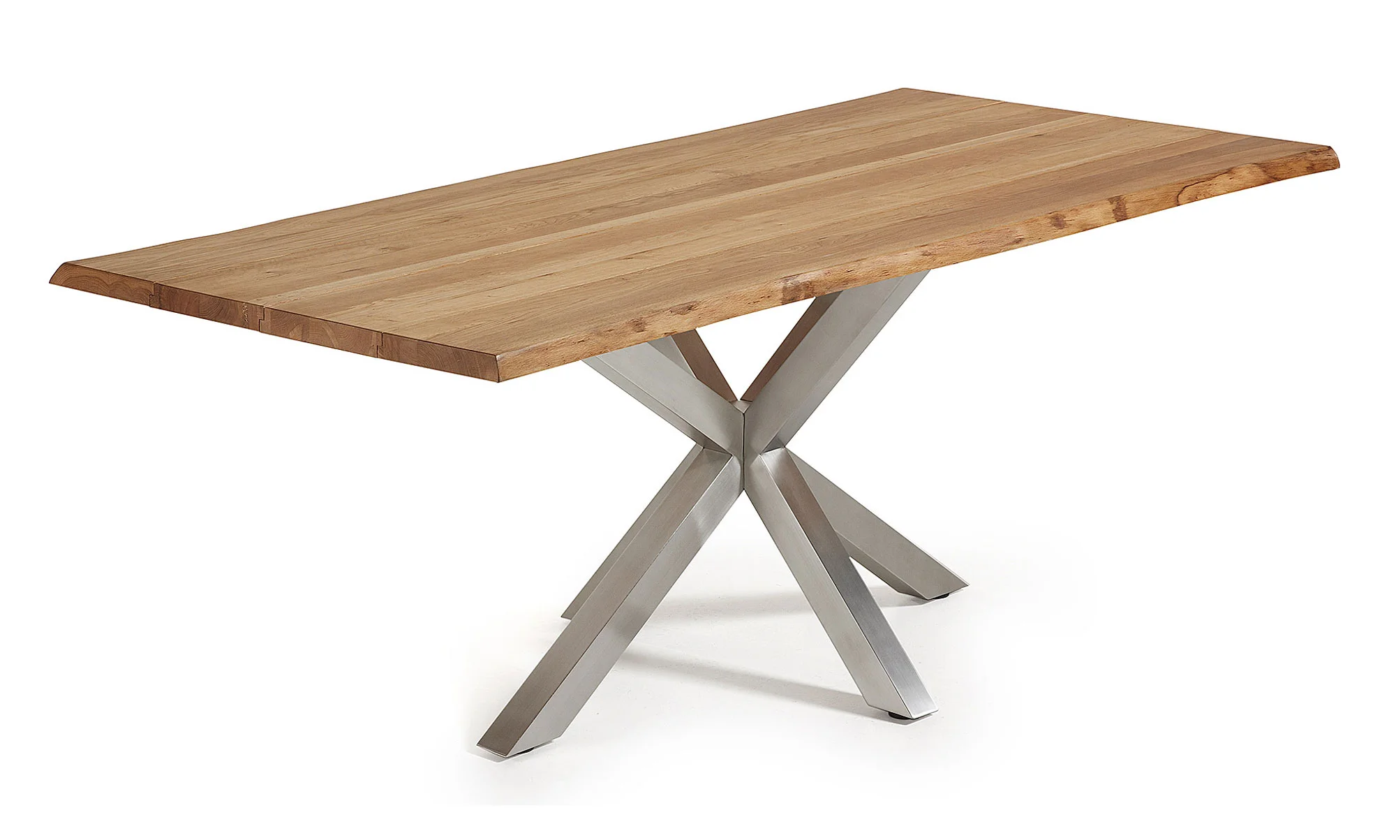 Mesa con pies de acero inoxidable mate y sobre en roble acabado natural con cera. Grueso del sobre 4 cm.