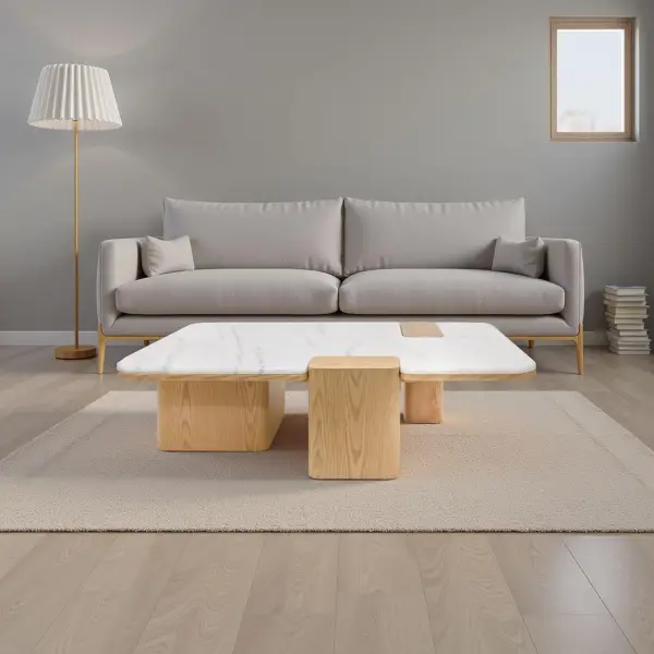 Mesa de centro Apolo de roble y porcelánico blanco de 120 cm