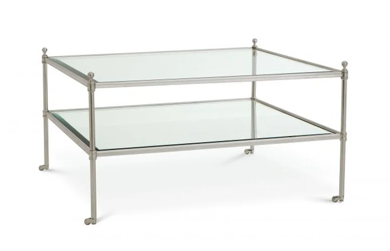 Esta mesa de centro está hecha de cristal con una base de latón.
