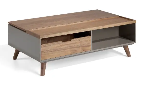 Mesa de centro rectangular con sobre elevable de madera MDF acabada en nogal y cuerpo inferior lacado en color moka alto brillo con varios compartimentos y cajón extraible. Patas de haya tintadas en tono nogal