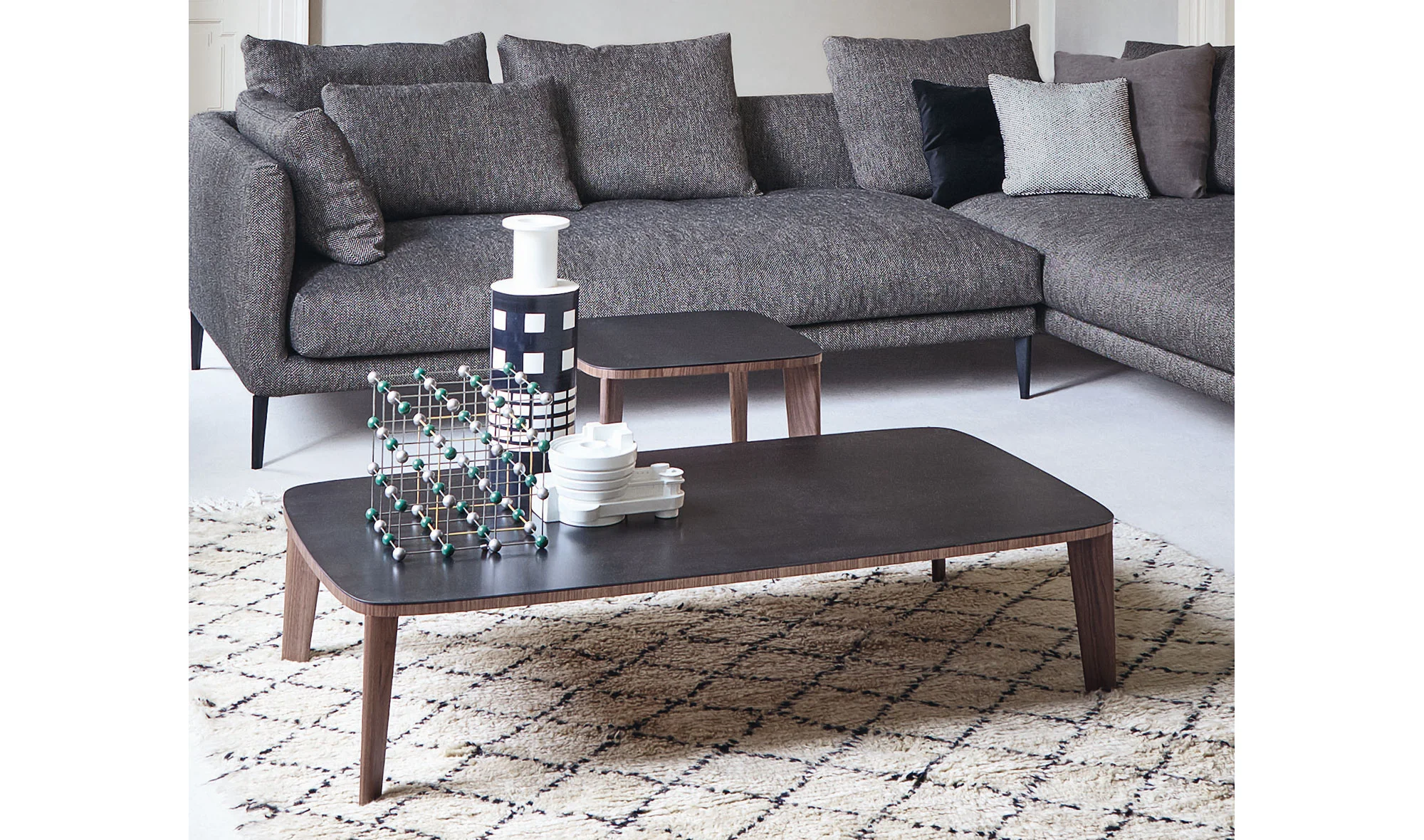 Acabado mesa de rincón: base en nogal americano y sobre en cerámica mate gris grafito