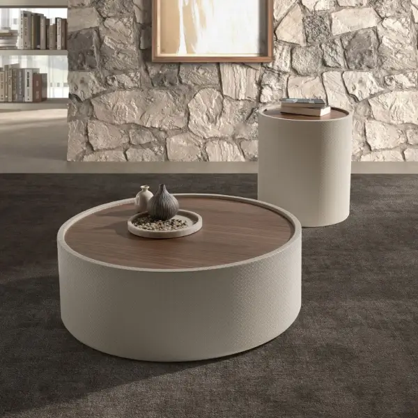 Mesa de centro redonda de diseño moderno, con tapa en madera chapada en nogal natural que aporta calidez y elegancia al espacio. Sus originales patas tapizadas en polipiel color arena crean un contraste sofisticado y actual, convirtiéndola en una pieza única. Su diseño combina sencillez y estilo, ideal para añadir un toque distintivo y personal a cualquier salón contemporáneo.