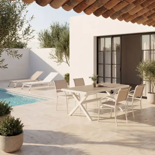 Mesa de exterior de 185 x 94 x 75 cm con diseño elegante y gran resistencia, ideal para terrazas, jardines y patios. Su estructura de aluminio blanco ofrece ligereza y durabilidad frente a la intemperie, mientras que la tapa de cerámica efecto madera aporta un acabado natural y sofisticado. Su tamaño permite reunir cómodamente a familiares y amigos, combinando estilo, fácil mantenimiento y funcionalidad para espacios exteriores.