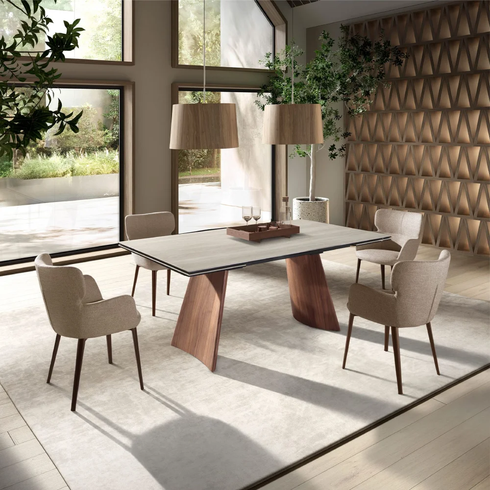 Mesa de comedor extensible rectangular de diseño moderno, con sofisticada tapa de mármol porcelánico en color arena y elegante acabado mate. Su estructura se completa con resistentes patas de acero inoxidable lacado en imitación madera nogal, aportando calidez y estilo contemporáneo. Gracias a su sistema extensible, esta mesa se adapta fácilmente a diferentes espacios y necesidades, convirtiéndose en una opción práctica, funcional y versátil para el uso diario en comedores modernos.