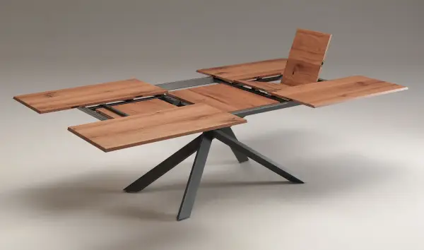 Un sistema de apertura exclusivo 4x4 utiliza un sistema de apertura innovador basado en el movimiento geométrico de las tapas que permite pasar de 100x200 cm de la versión cerrada, a una extensión de 138x254 cm abierto. La característica del producto está en la intersección perpendicular de las venas que revela un elegante juego de superficies de madera. Una sólida estructura cruzada realizada en metal en finiciones de moda